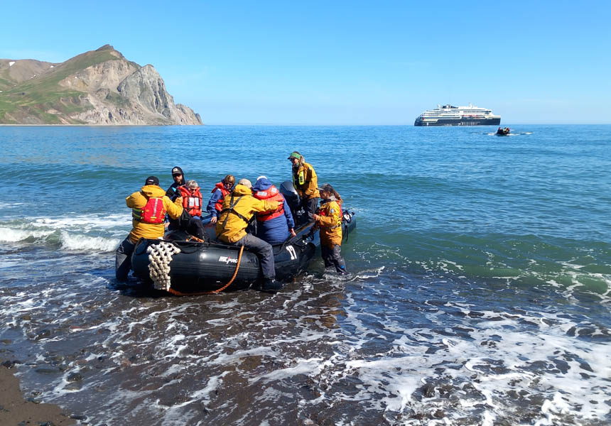Many of the transfers from ship to land are by Zodiac and often you will wade through the waves on landings. HX provide waterproof boots you keep throughout the cruise for this and a storm proof expedition jacket which you can take home with you. These zodiac trips really make this cruise such a memorable experience. On one occasion we were almost surrounded by Sea Otters sleeping sedately on their backs, some with cubs on their chests.