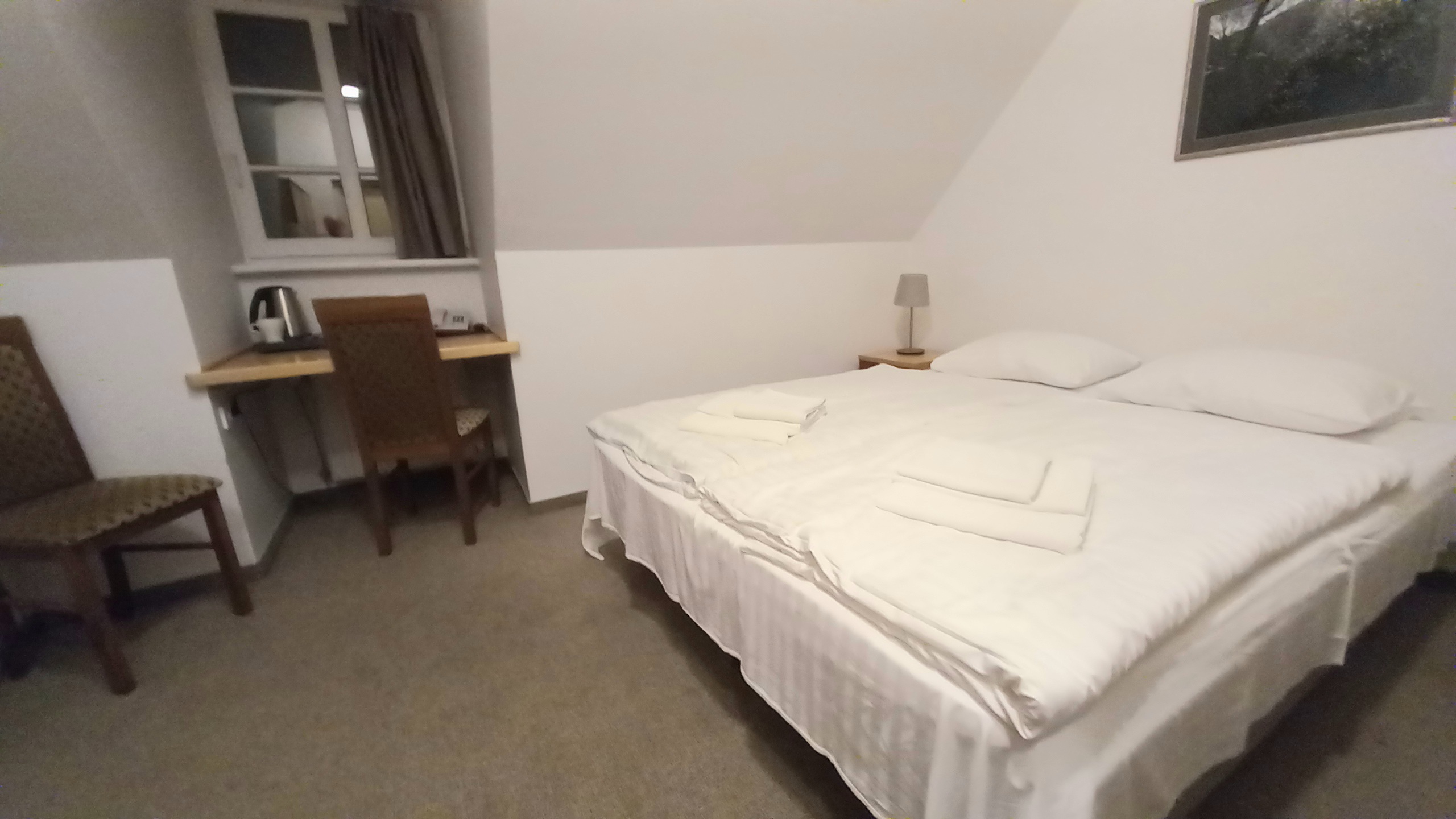 Our standard double room (412) was on the fourth, top floor. It was small and simple with a sloping ceiling which meant being careful getting in and out of bed. The two doubles pushed together had individual duvets and, although there was only one pillow each, there was a spare in the wardrobe. Only one side of the bed had a table, light, and charging point. There was a small desk and two chairs, a wall-mounted TV and tea and coffee making facilities. Although bottled water was not provided, the tap water was said to be filtered and drinkable.