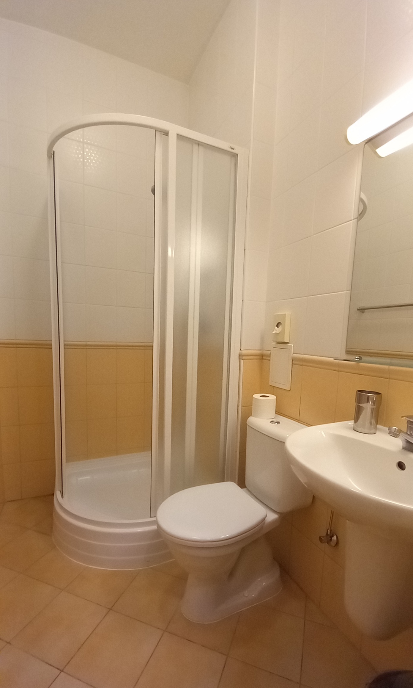 The small bathroom was in proportion to the bedroom. The tardis-like shower cubicle supplied relatively powerful hot water, and shower gel and hand soaps were provided. The wall-mounted hairdryer was efficient and near the mirror. There were plenty of towels and a heated towel rail which we couldn’t switch off and as the room got very hot, we left the window open. As bells from the nearby church rang on the hour from 7am, an alarm clock was not required.