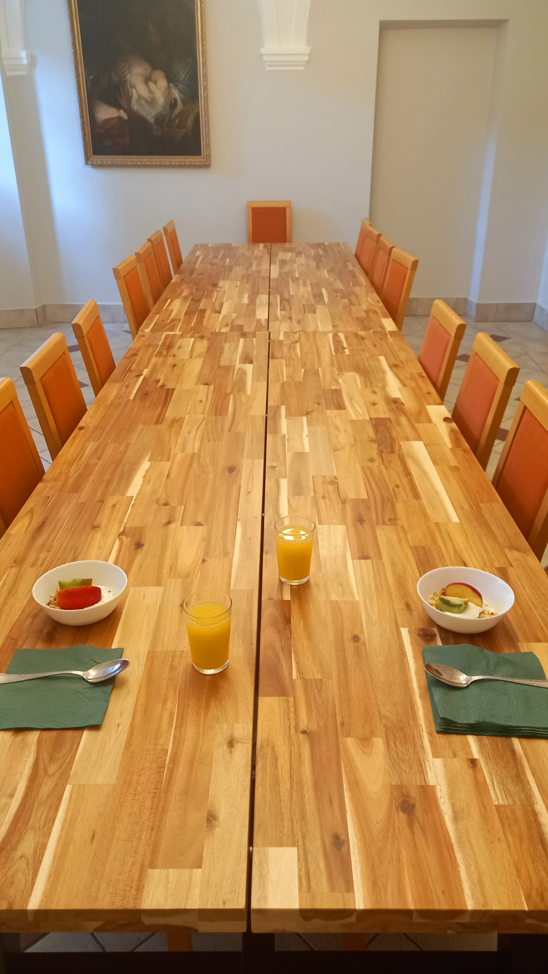 As our evening flight was delayed, we didn’t arrive at the hotel until 1am, so we were pleased that check in was slick and efficient. Despite our late arrival, we were awake early and found the ground floor cafe just after 8am (breakfast was available from 8am to 11am). Unfortunately, everyone appeared to be in breakfast at the same time, and as all the tables were full, the helpful receptionist unlocked a nearby room with a refectory table seating 14. We just managed to get a photo, but it was not long before we were joined by others.